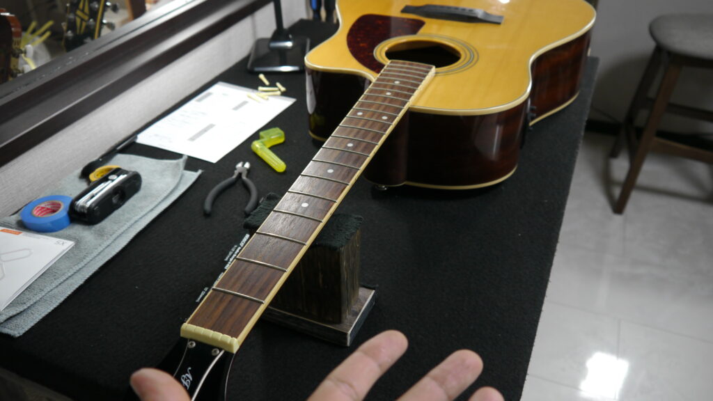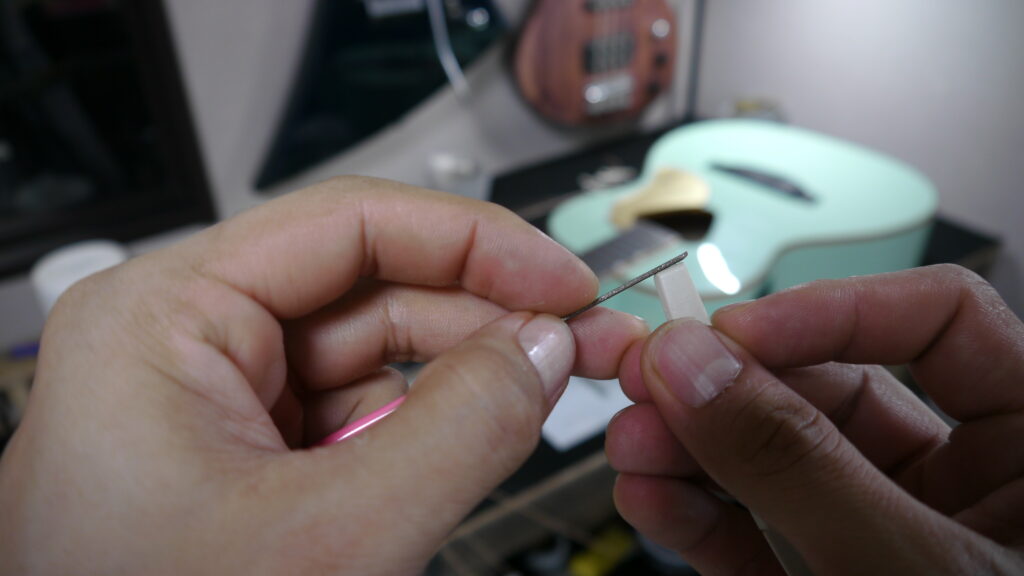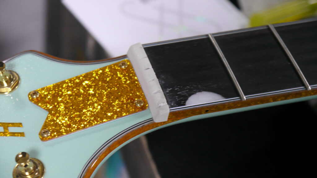 指版をキレイにした所でナット調整作業開始です♪