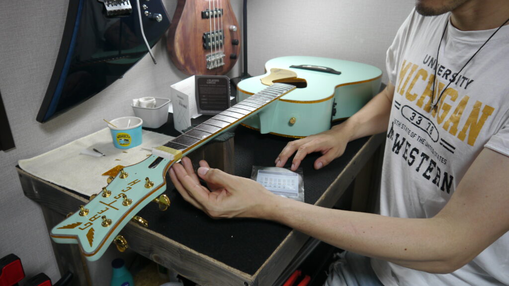 お持ちいただいた時には、ビビりがあり、エンドピンジャックがゆるく、ネックがストレートの症状等が見られました🤕