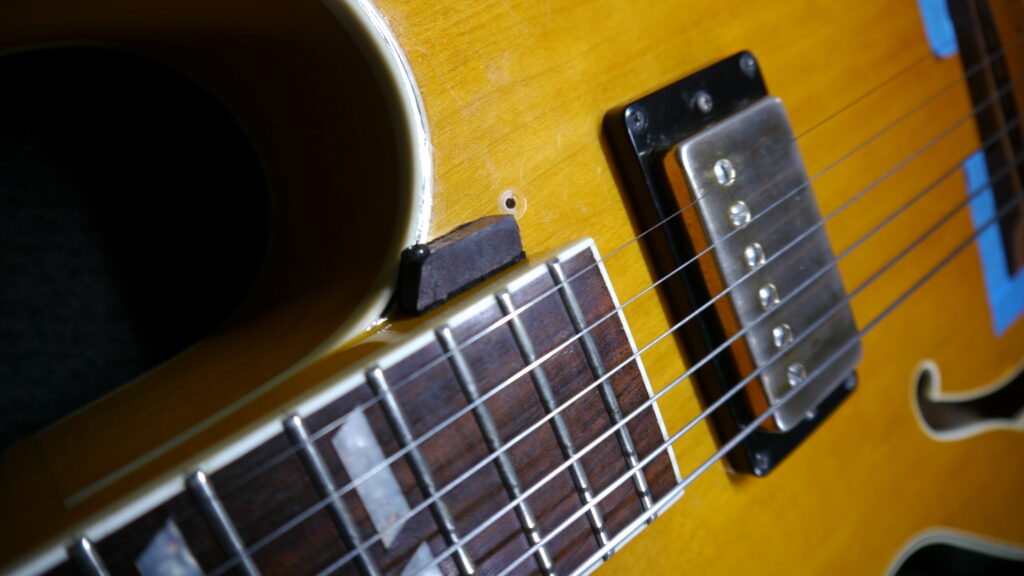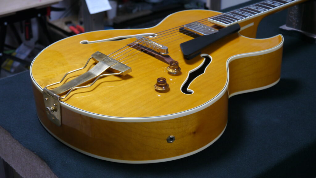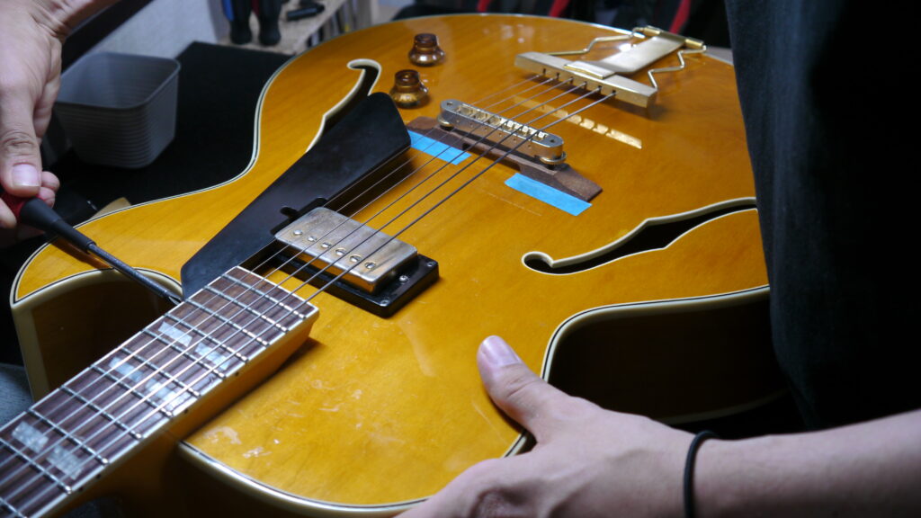 このようなホロウボディのアーチトップはとても敏感で、弦の振動が伝わり過ぎてしまい、ハウリングをおこしてしまいます。今回のハウリングの原因の一つを確認できました。