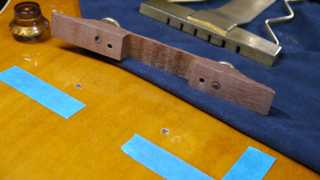 こちらのアーチトップタイプのブリッジの金具がボディと接触があってはいけませんが、あたってしまっておりました(ボディにも跡があるのがご確認いただけます)🤕