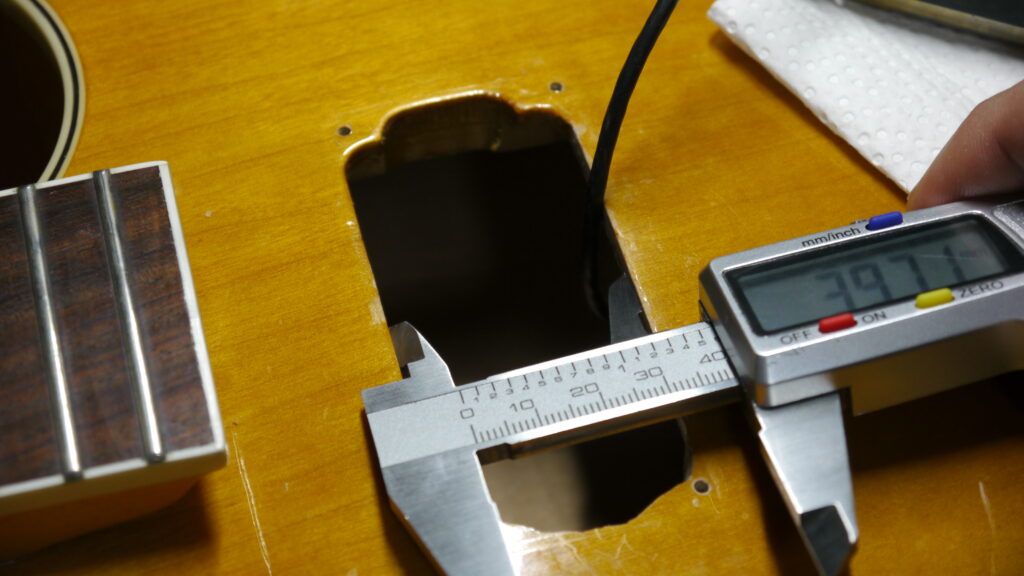ピックアップキャビティに少し余裕がないと、ピックアップやエスカッションとボディと接触してしまい、振動が直接伝わりハウリングの原因になっていまいます(ホロウボディはかなり敏感です)🤕