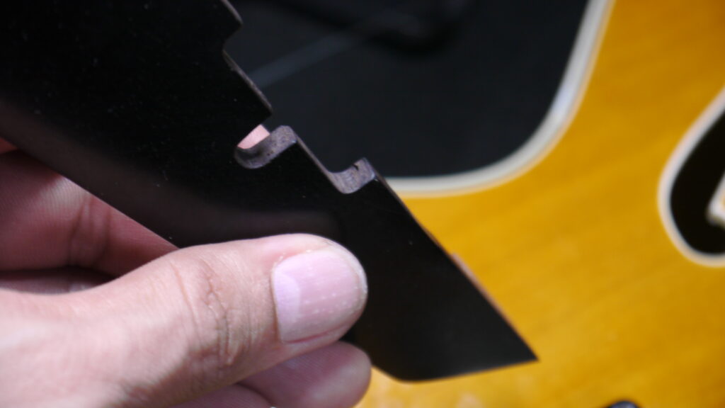 対策として、ピックガードの固定方法の調整や一部をリシェイプする必要がございます。