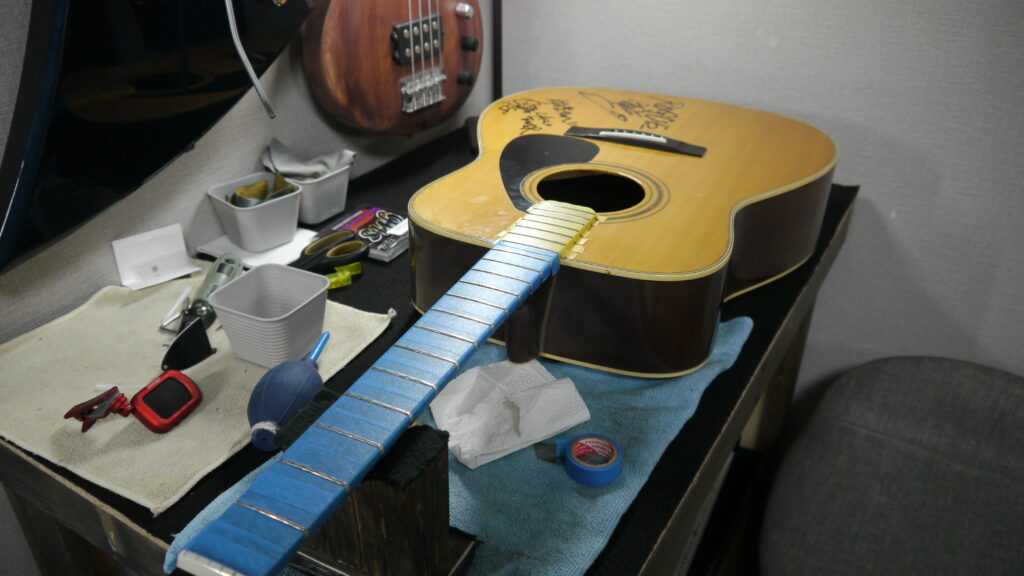 さあ、フレットクリーニングの現場です!フレット研磨の前には、指板をマスキングテープで丁寧に保護します😊