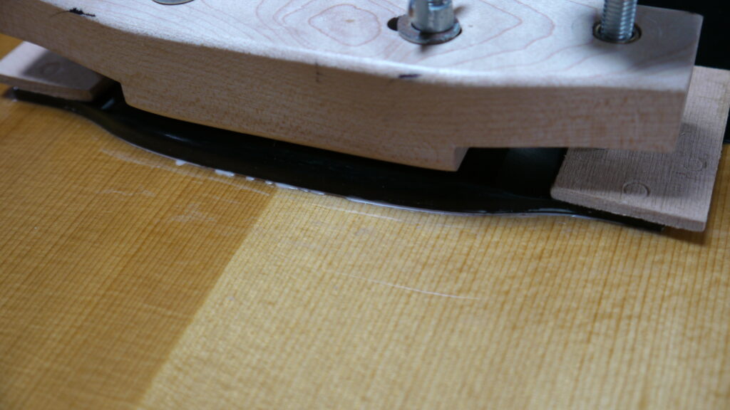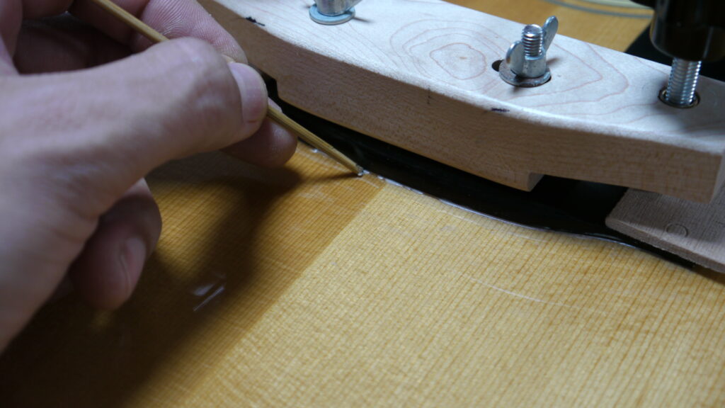 この修理では、弦を張った状態の強いテンションを利用します。ブリッジが剥がれようとする力を逆に利用し、その隙間に特殊な接着剤を浸透させます。