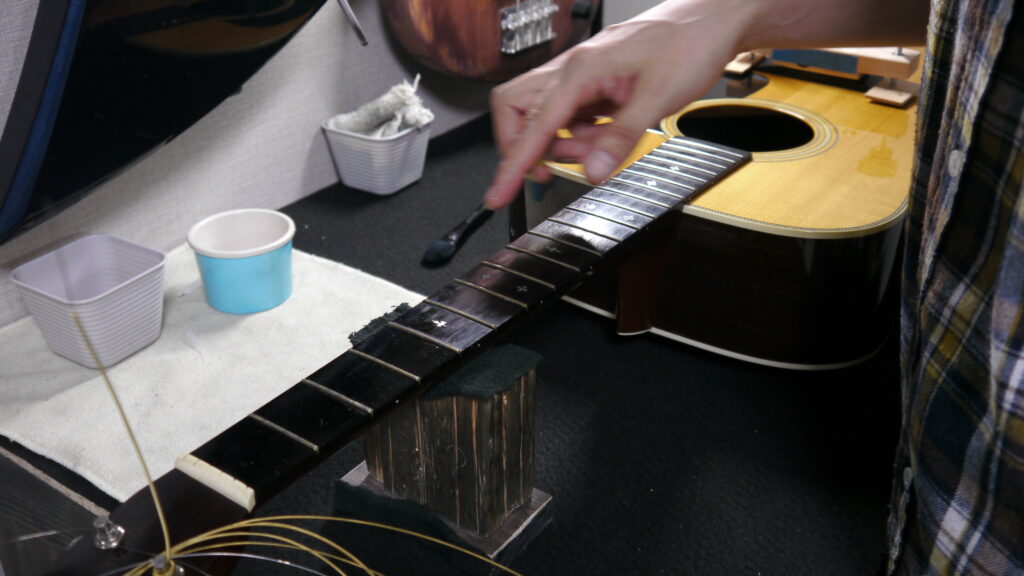 3日後、いよいよネックの作業に移ります。指板を一丁寧にクリーニングし、しっかりとケアしていきます✨