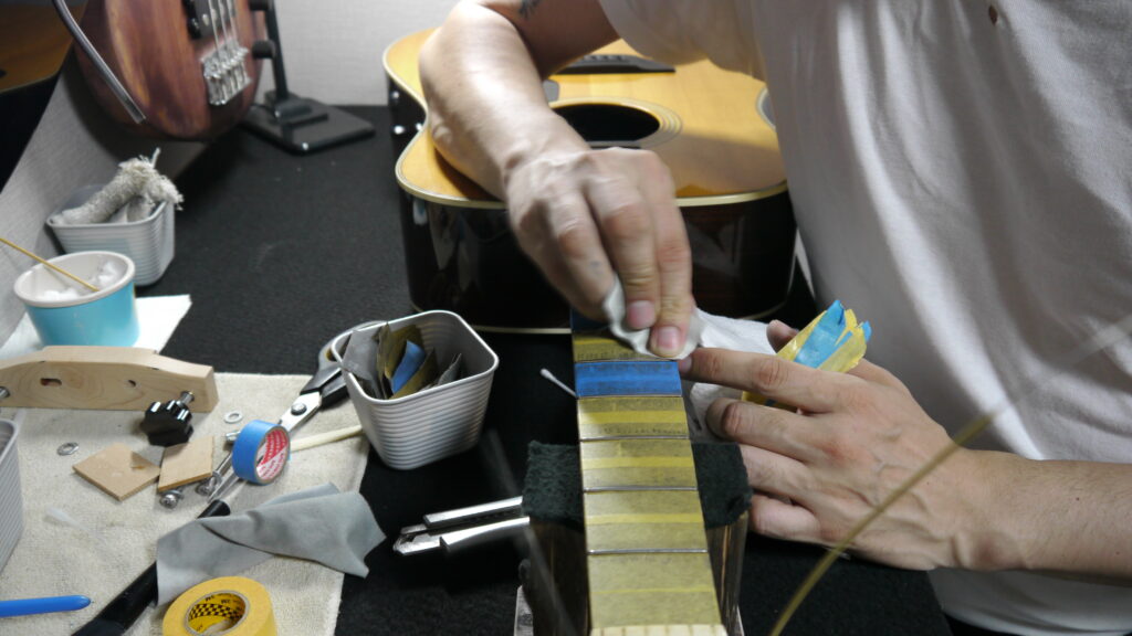 マスキングテープをしっかりと施し、フレットを一本一本丁寧に研磨していきます。