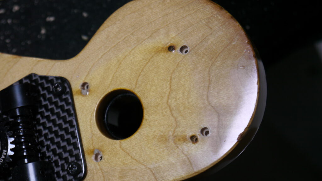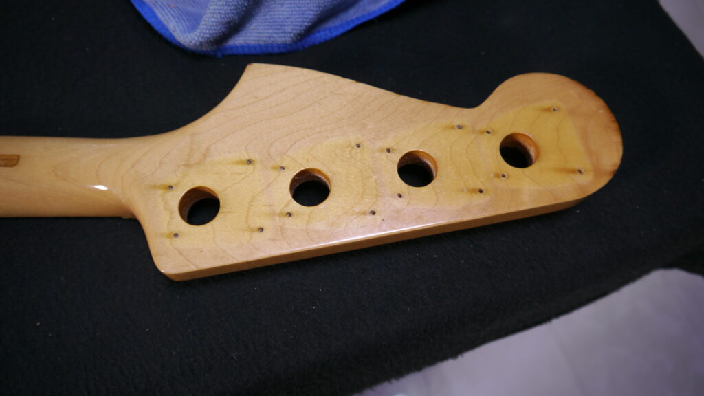 旧ペグ跡の小サイズビス穴 8ヶ所を埋め、新ペグに合わせて新たに16ヶ所の穴を精密加工