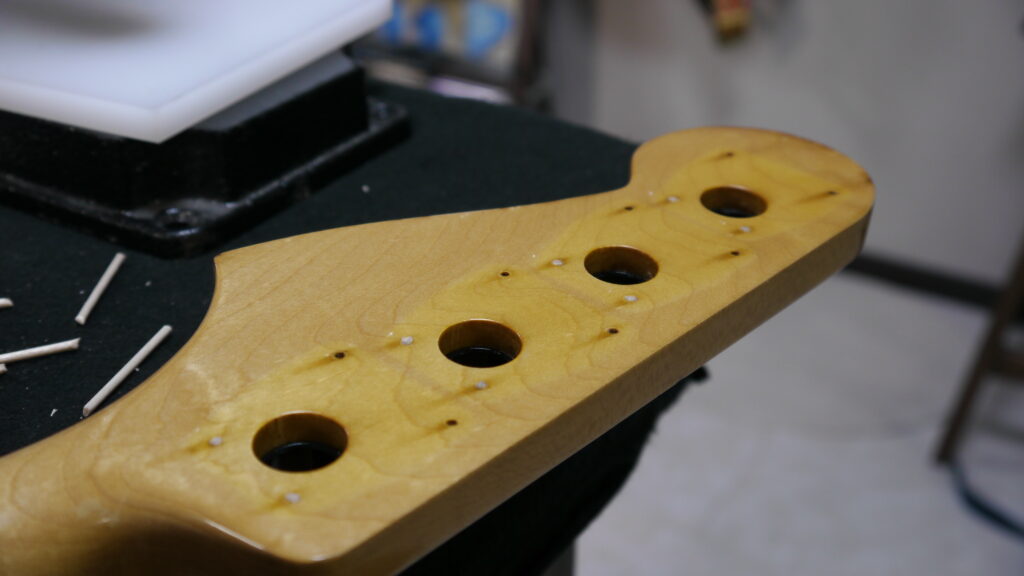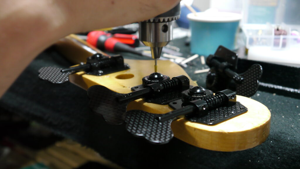 実は… ゴトーのペグ専用の特殊な形状のビスに合わせて、一つひとつ丁寧に穴あけを実施。これにより、最大の固定力を発揮する“土台”が整いました😎