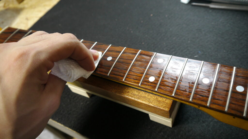 指板の汚れを優しく除去し、オイルでしっかりとケア。木材が生き返るような、なめらかな感触によみがえらせてまいります😊