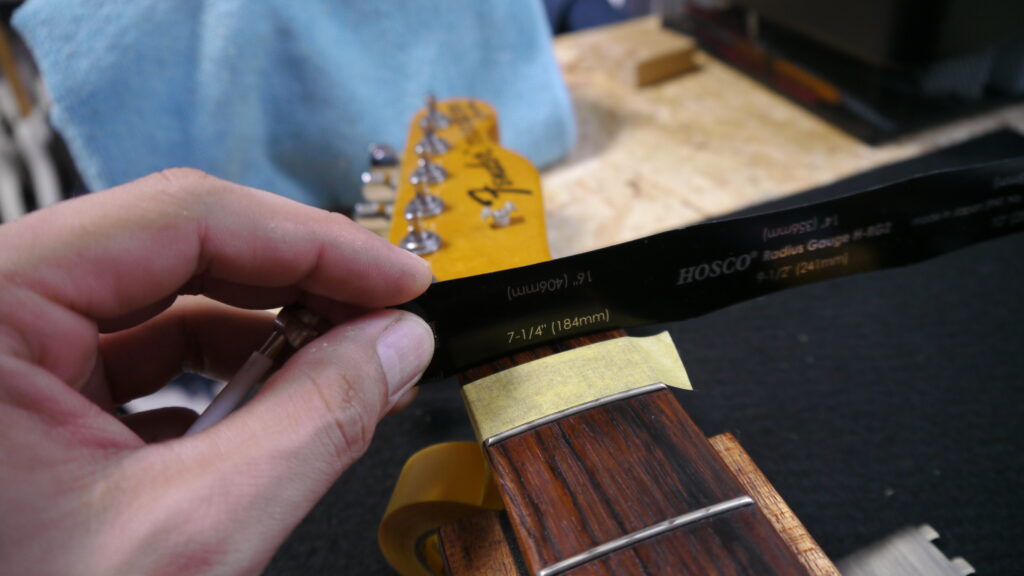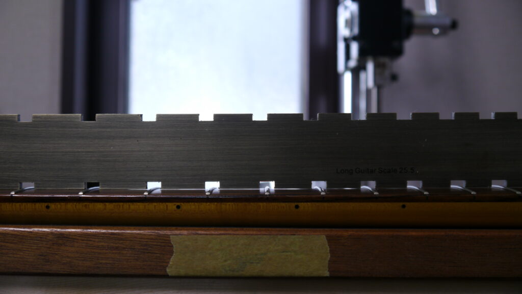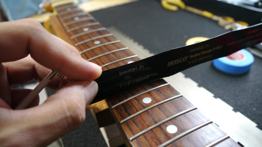 このお写真では、R(アール)を確認中です。フレットのカーブを正確に計測し、最適な状態に整えてまいります。
