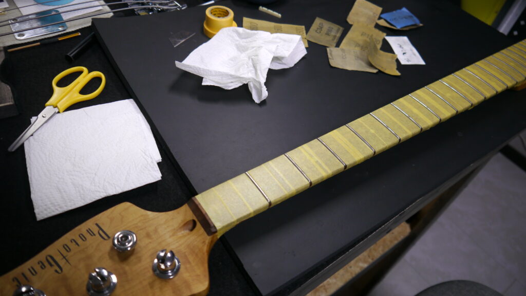 マスキングテープを貼り、ナット交換前にフレット研磨を行います。