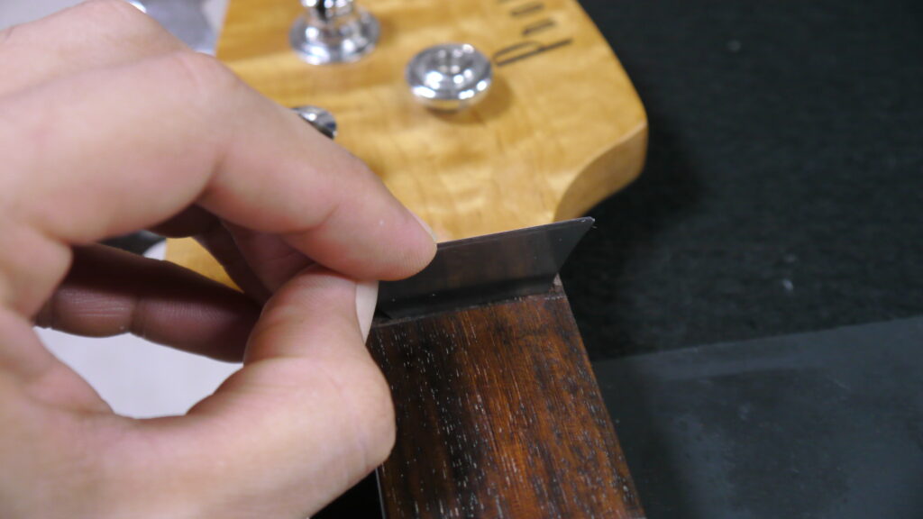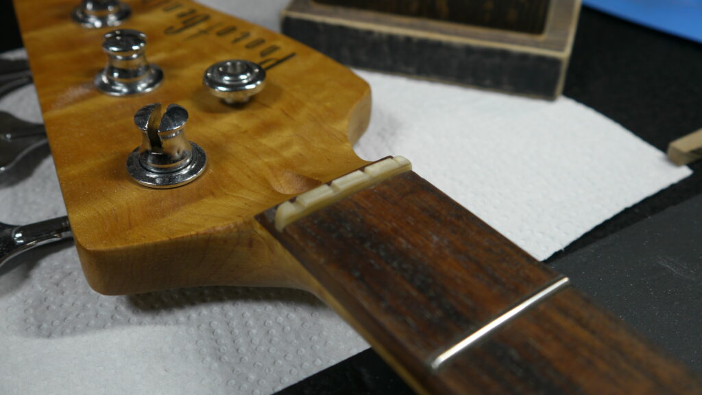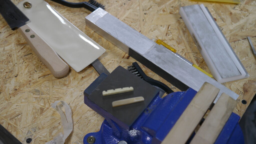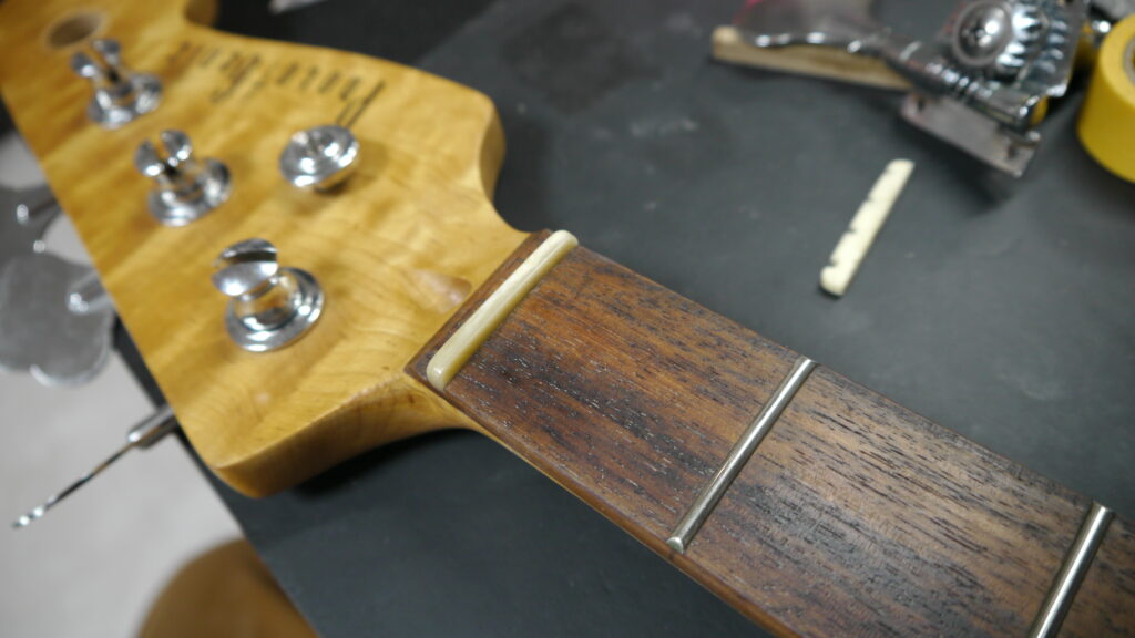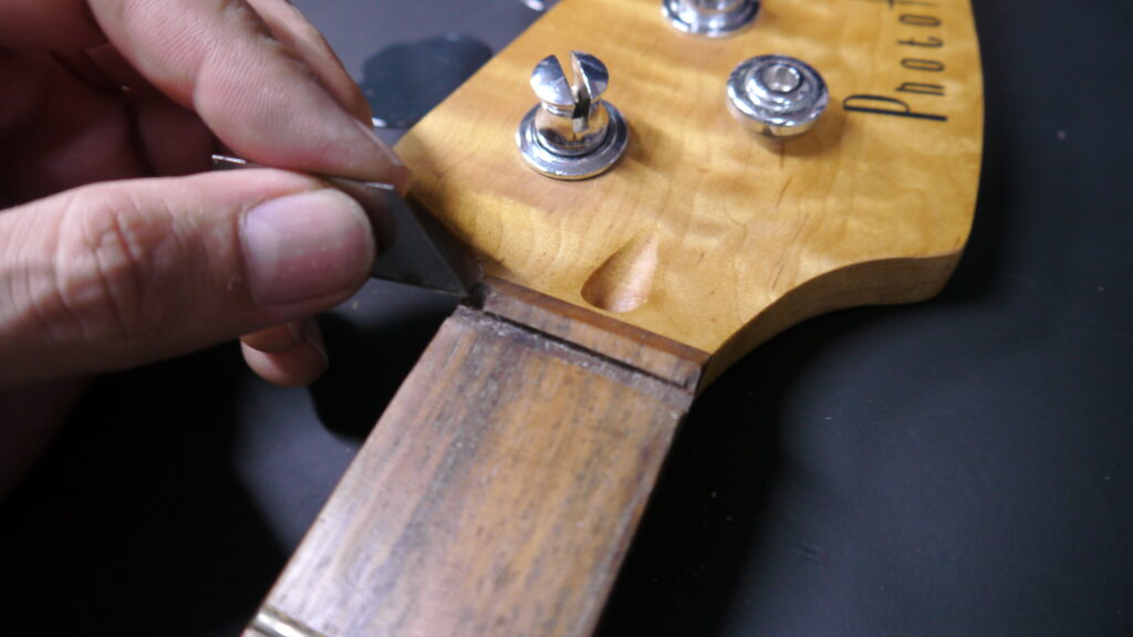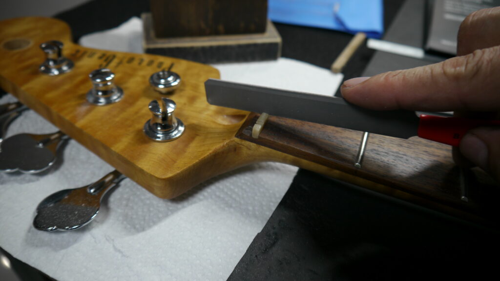 この作業がなければ、新しいナットがぴったりとフィットせず、音程や弦高の安定した良い仕上げはできません💪