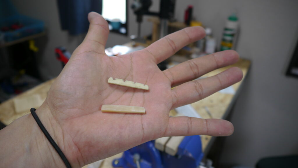 手前が古いナットで、奥に写っているオイル漬けのナットを材料に、お客様のベースにぴったりのナットを作っていきます😎