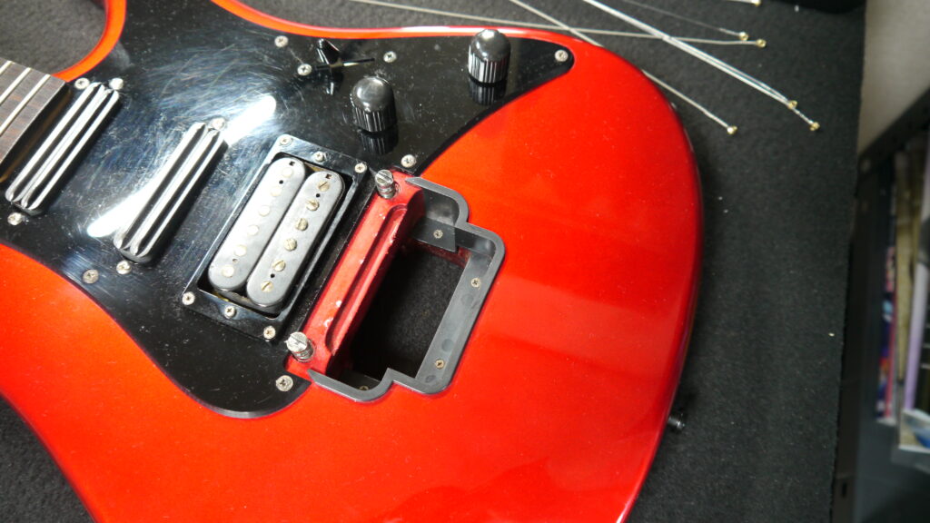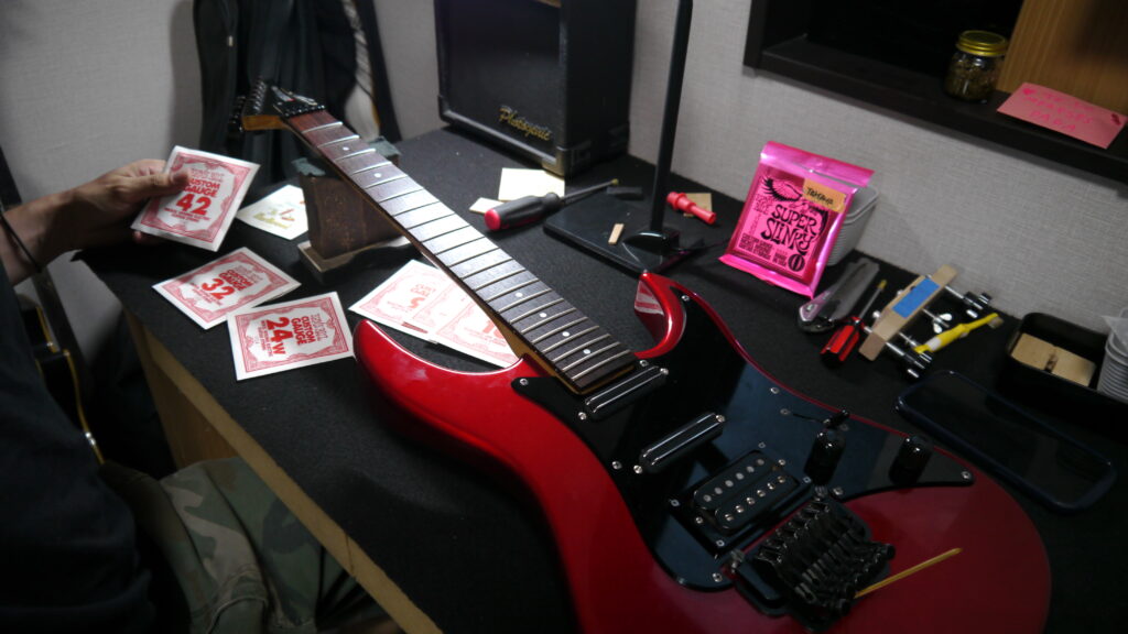 保管期間が長かったギターの「再生」作業。フロイドローズの分解洗浄と調整、ピックアップ高さの最適化、ネック接合部と錆びたパーツの修正まで、一点一点の丁寧で精密な調整を実施。