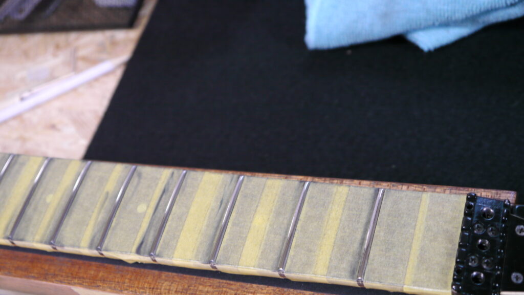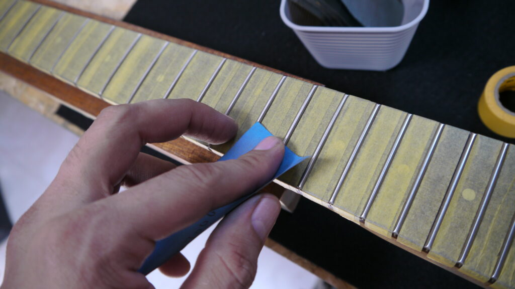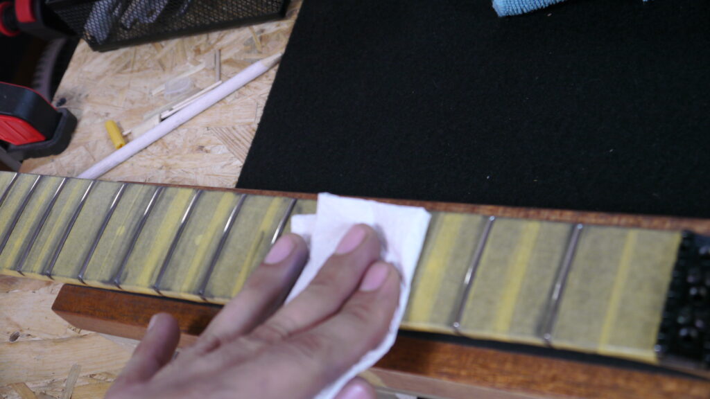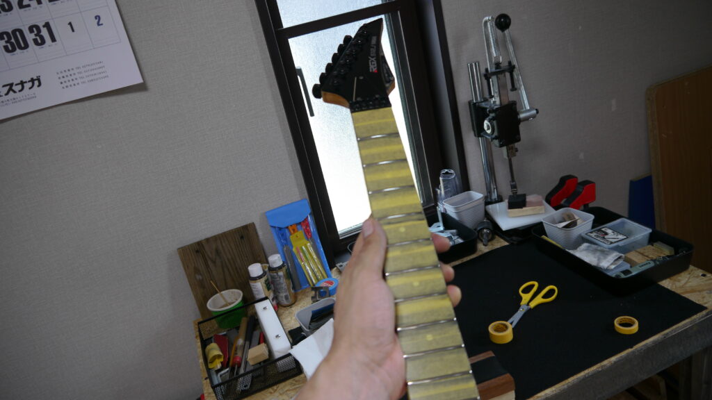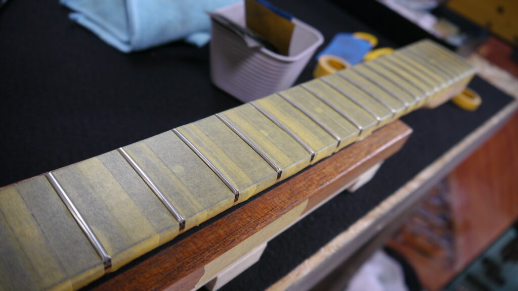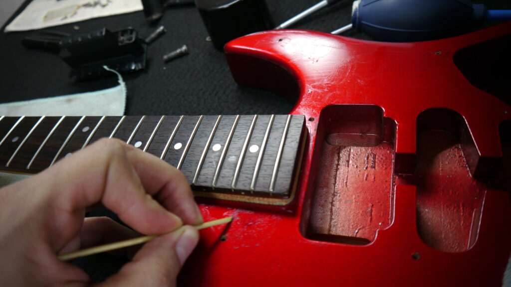 フレットの研磨作業を行い、美しい光沢と滑らかなプレイアビリティを実現します✨