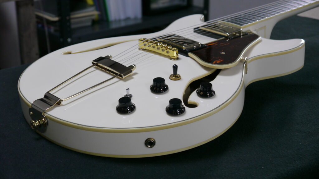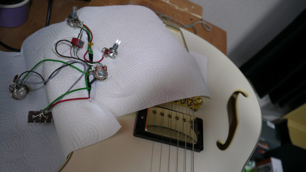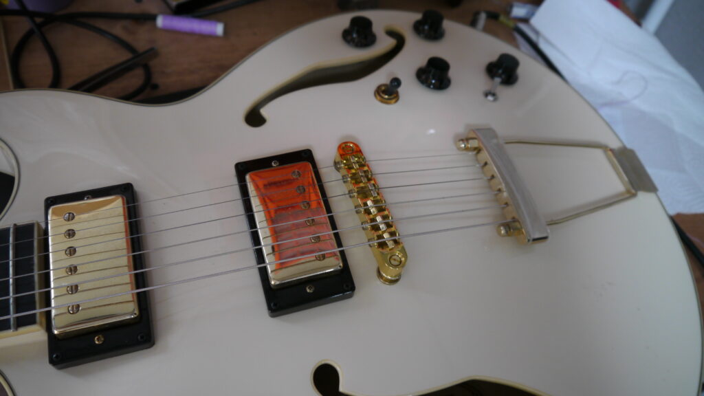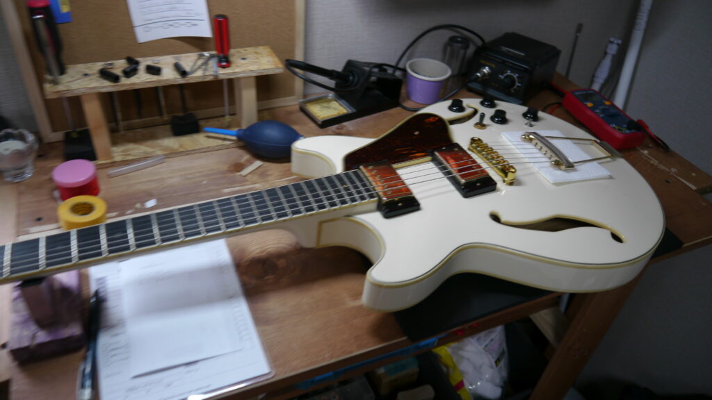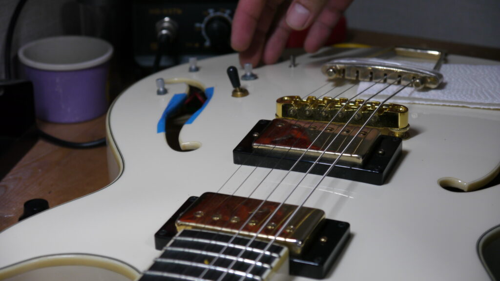 このギターの場合、アーチドトップのF字孔から内部の配線にアクセスいたします。