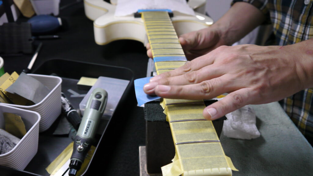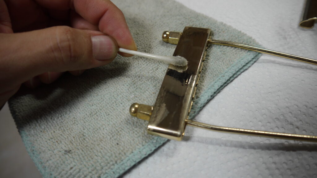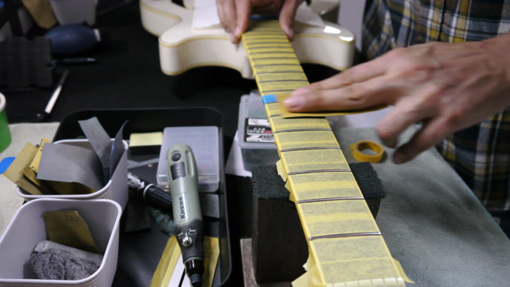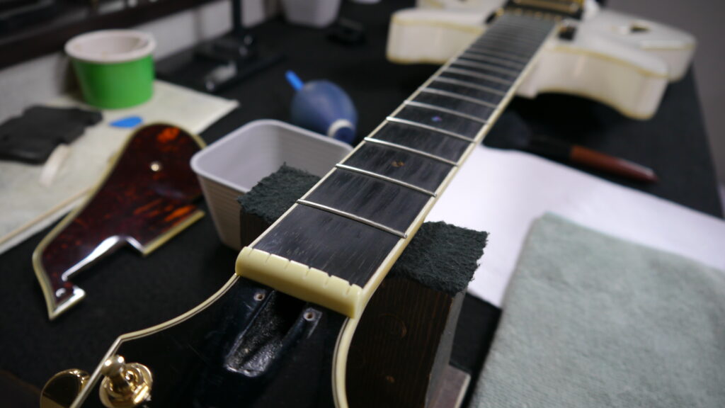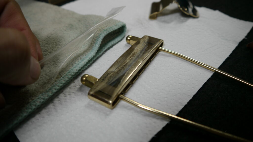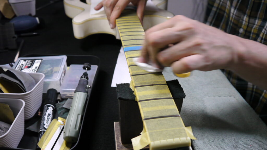 ケアを終えた後は、フレットのクリーニングです。丁寧に研磨を施し、鏡のようなツヤと光沢を出してまいります。