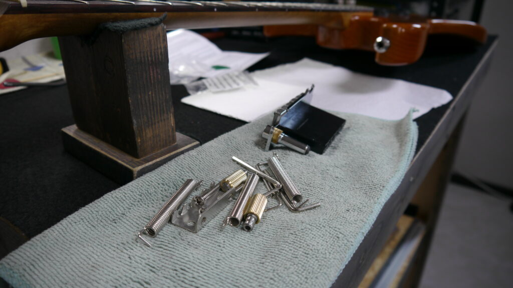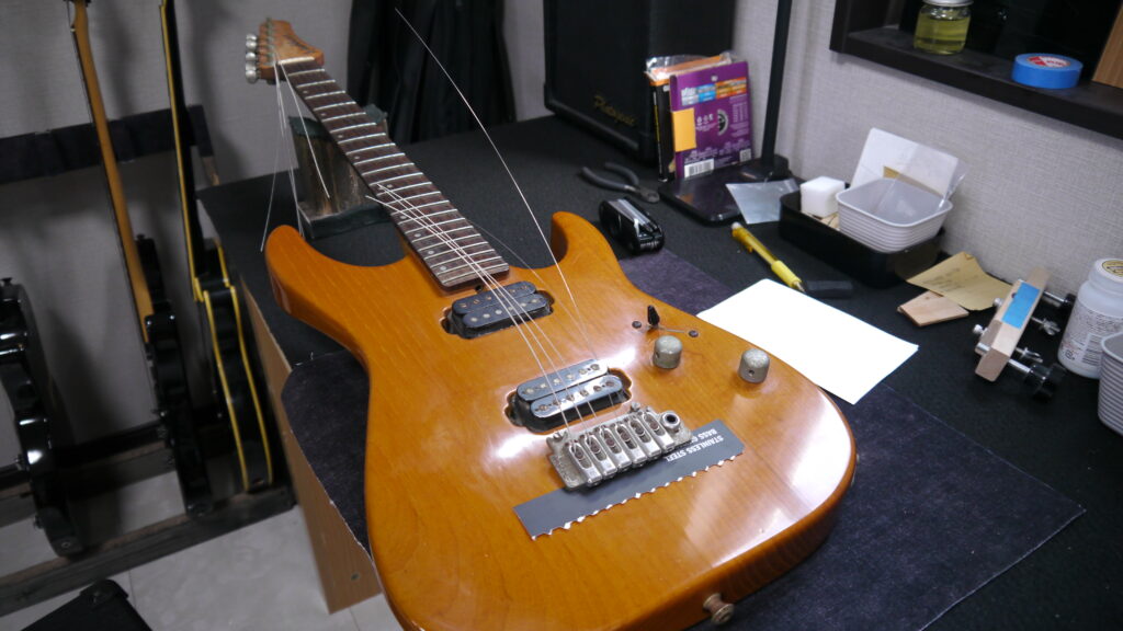 今回には、トータルセットアップ、フレットすり合わせ、ディープクリーニング、そしてブリッジ交換を実施してまいります。