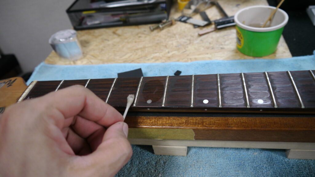 こちらも長年の使用により溜まってしまったフレット際の頑固な汚れを、専用工具と天然素材のココナッツオイルを使用して除去いたします。