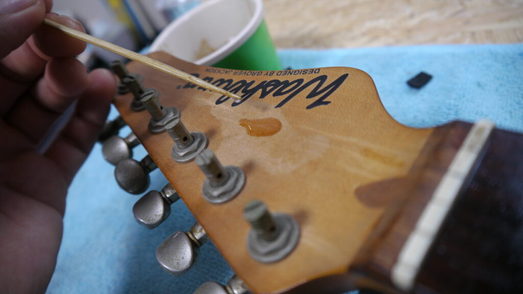 指板に天然のココナッツオイルを塗布し、古い汚れや油脂を浮き上がらせます。これにより、深部まで清潔になり、木材も生き返ります🔧🌿