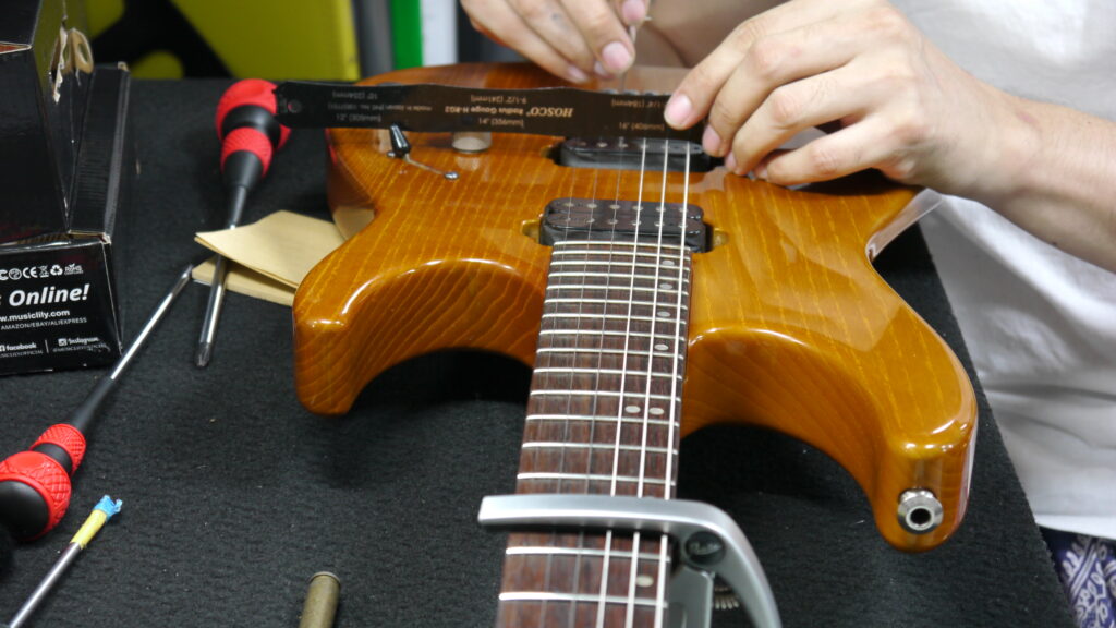 ブリッジのR(弦が載る面の半径)を正確に測り、それに合わせた調整を行います。
