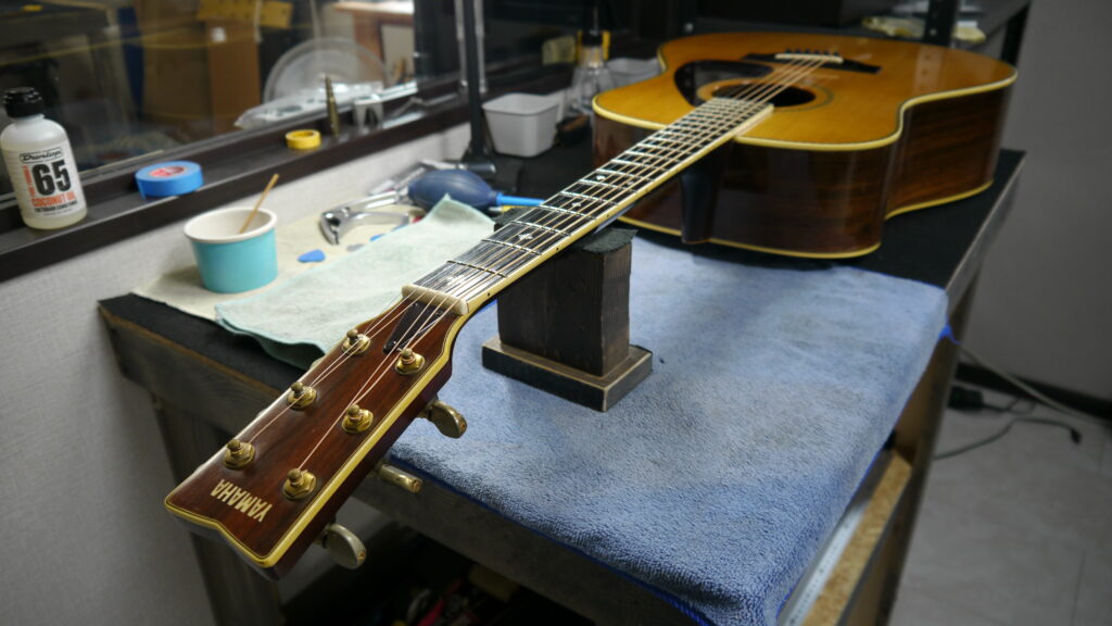 専用工具を使用し、塗装や指板を傷つけないよう細心の注意を払いながら作業を進めてまいります🔧