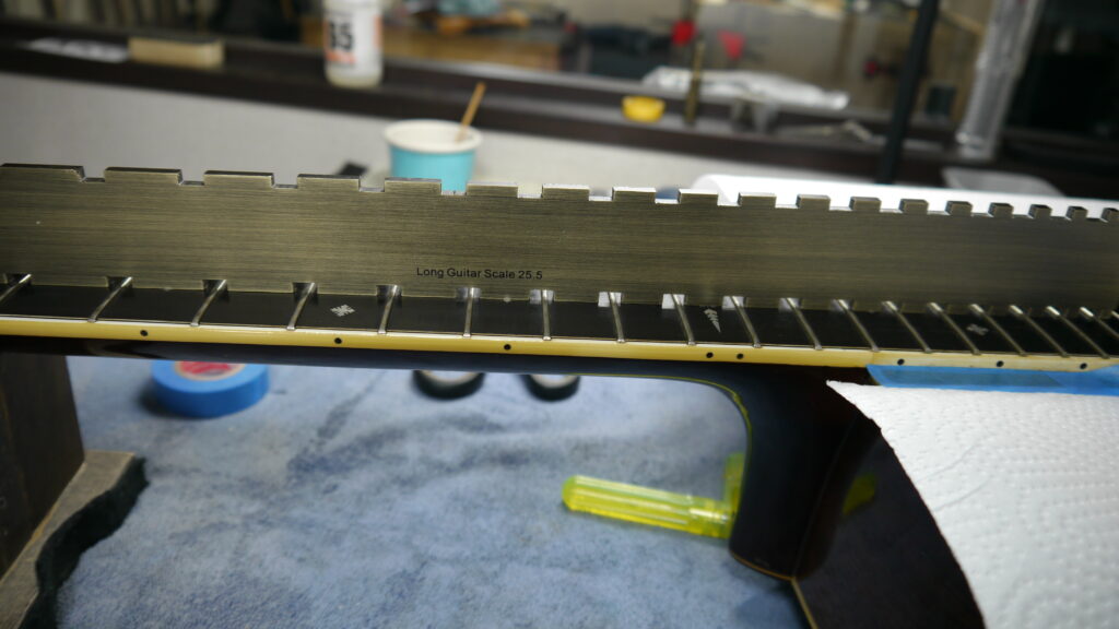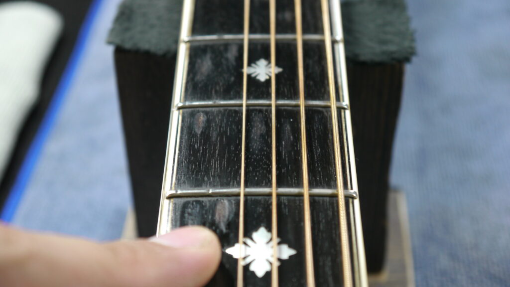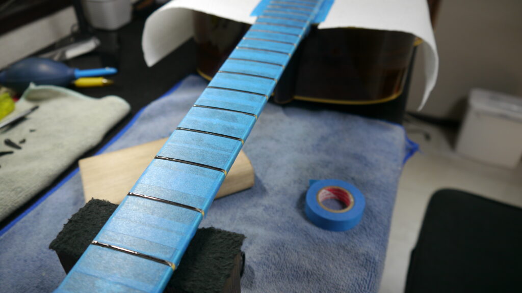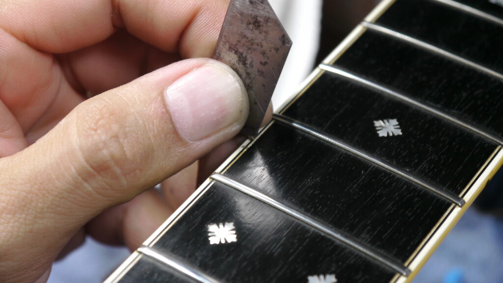 ネックを整えた後、摩耗したフレットのすり合わせを実施し、平坦で滑らかな演奏面を再生