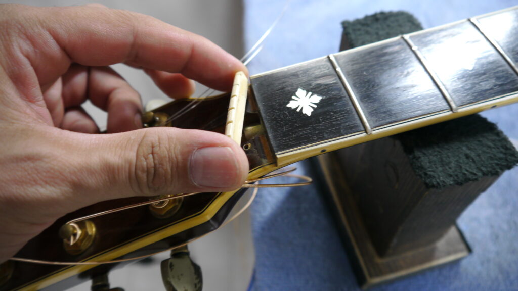 加工したサドルに新しい弦が張られ、ネックとの調和、フレット面の状態、ナットの位置を全て確認。ビビりも詰まりもなく、全てのポジションでなめらかに演奏できる、完璧な仕上がりを確認できました!🎸✨