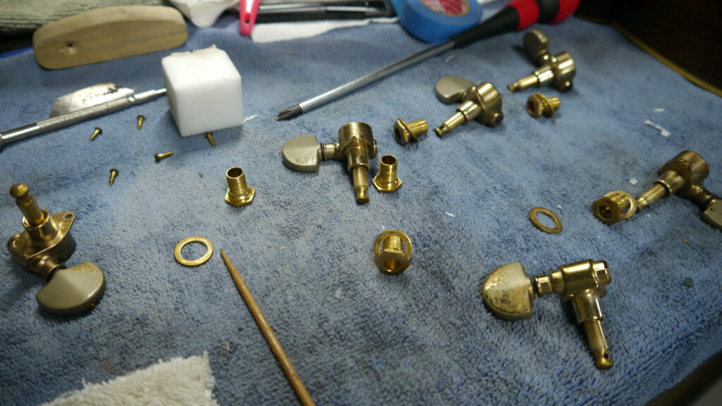 こちらでは、外したペグ(チューニングマシン)を分解し、たまった古い油脂や汚れを除去し、滑らかな動作と美しい外観を取り戻してまいります🔧✨