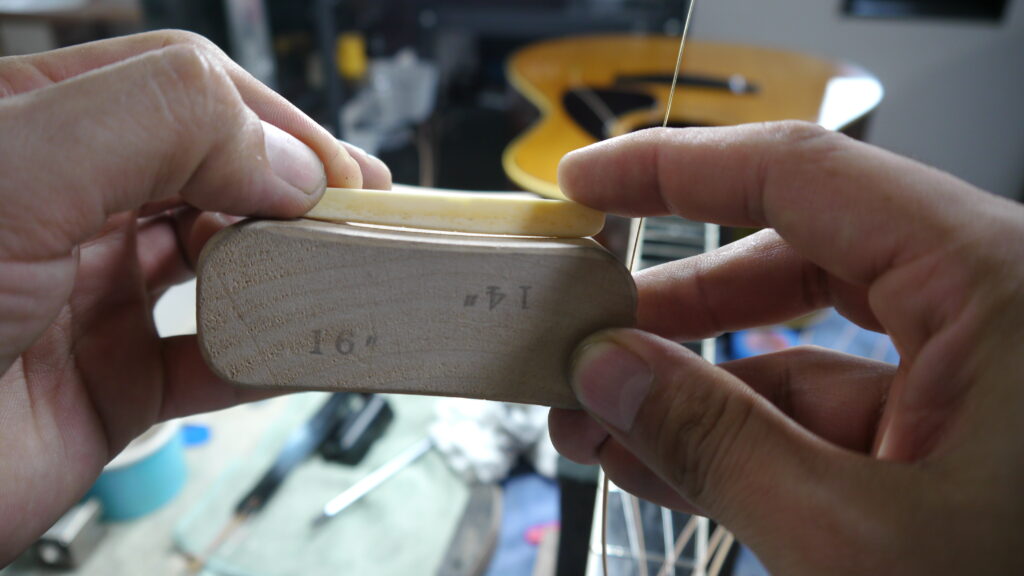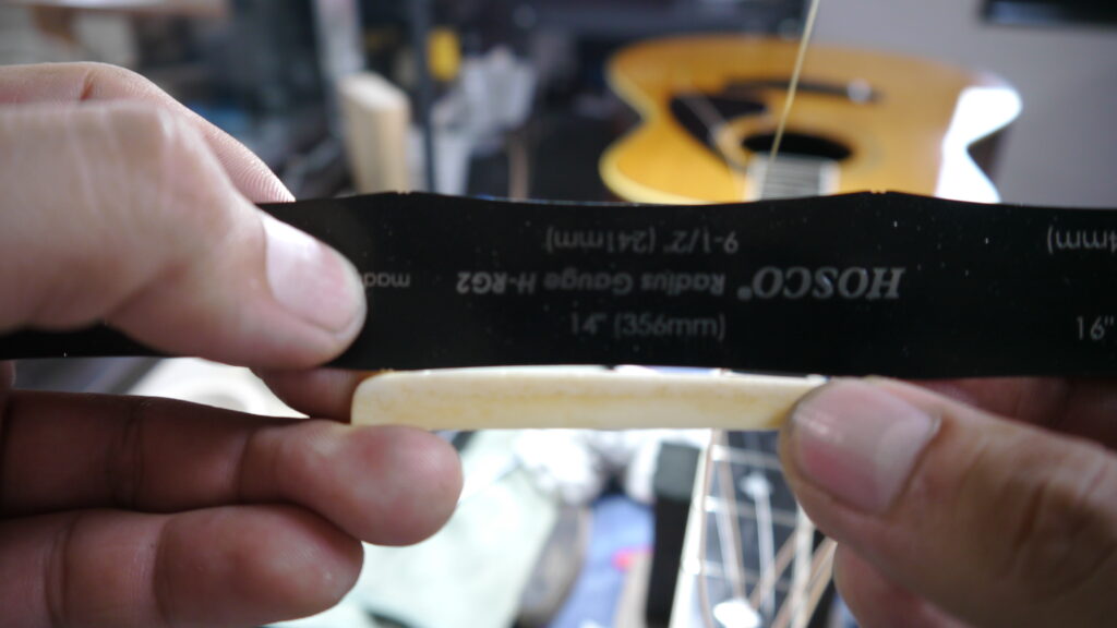 そのため、サドルを単に削るのではなく、このYAMAHA L-15のネックの特徴を計測・確認した上で、それに呼応するアール形状へと調整する必要がありました。