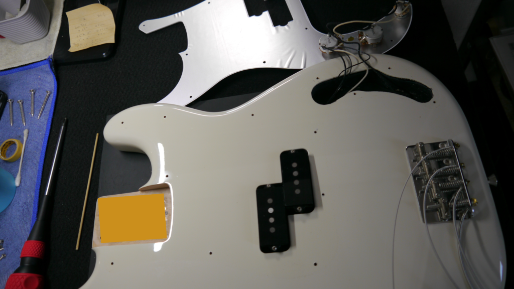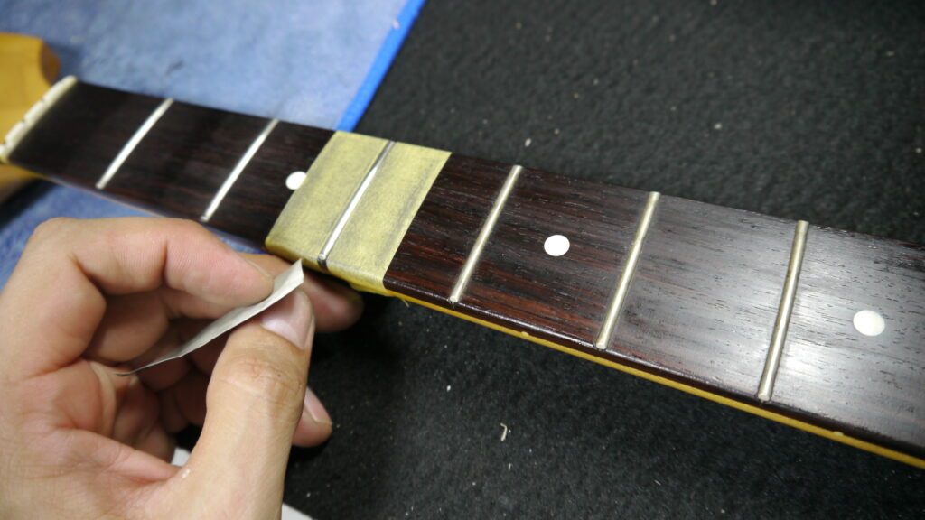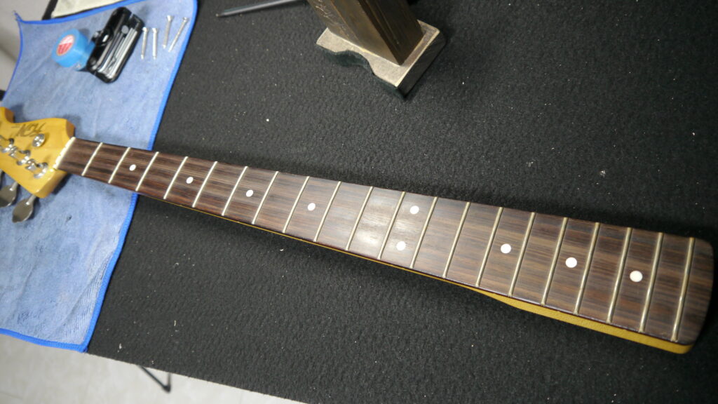 こちらは弦を張った後、ネック角度(ネックレリーフ)を調整し、弦とフレット面が適切な角度(90度)になるよう最終的に整えてまいります。