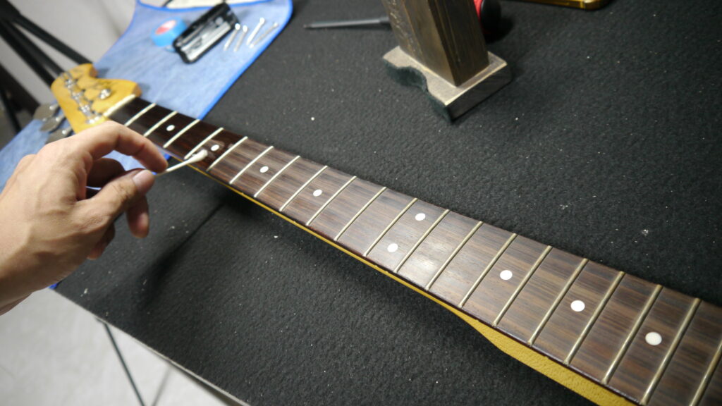 ネックリリーフと各弦のバランスを見ながら、お客様の求める弾きやすさとサウンドに合わせて、最終的な微調整を進めてまいります🎸✨