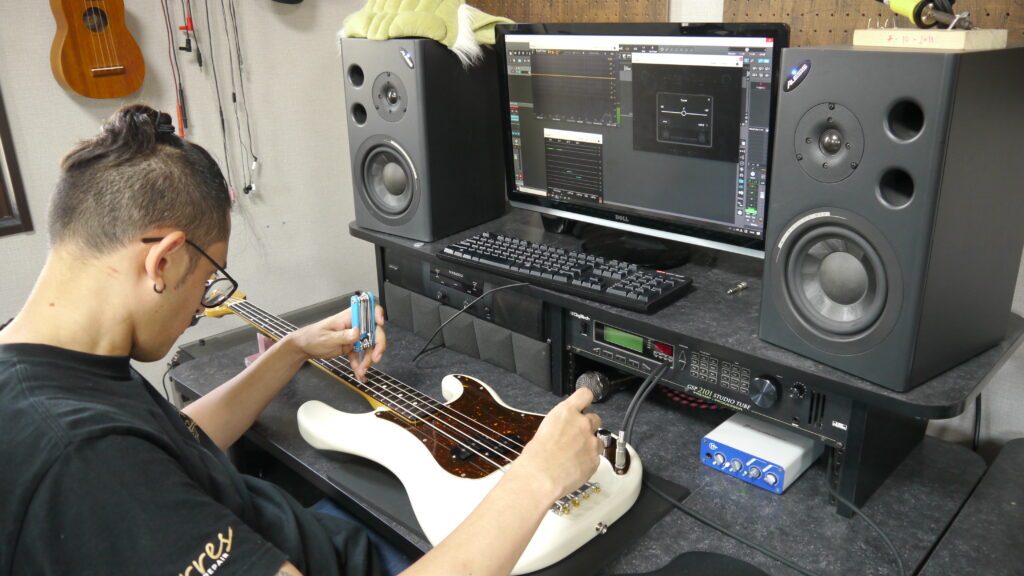 パソコンに接続して出力を計測しながら、各弦のバランスと全体の音圧が最適になるよう、高さを精密に調整していきます📊🎸