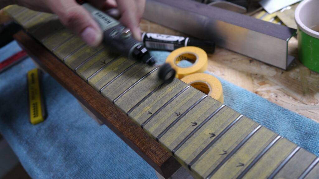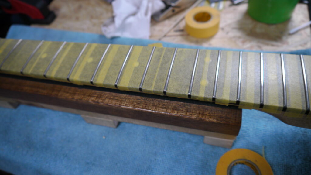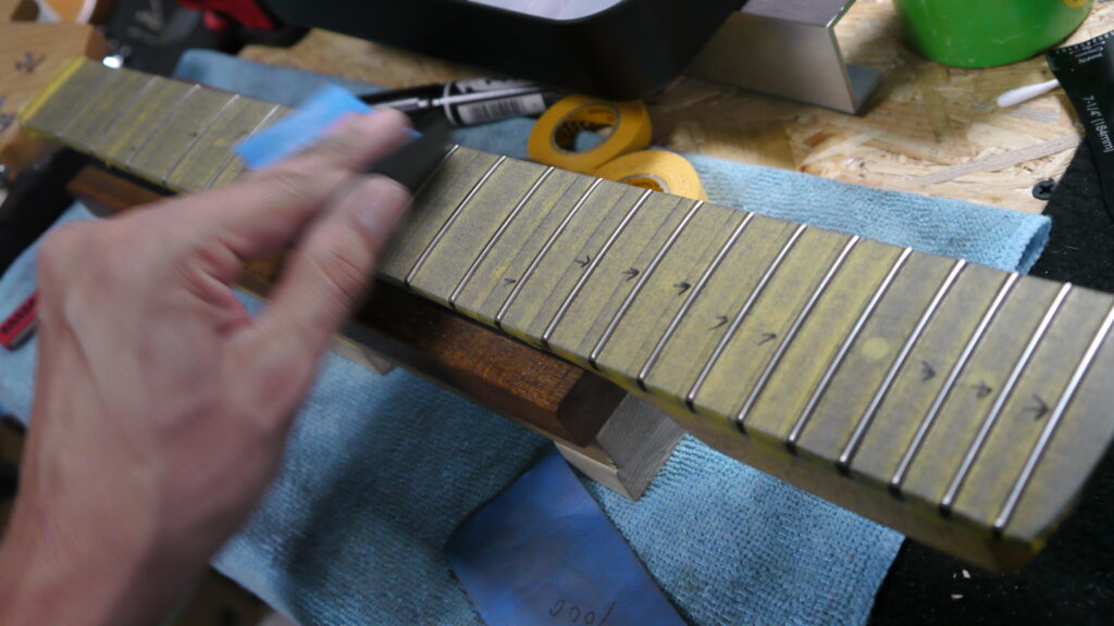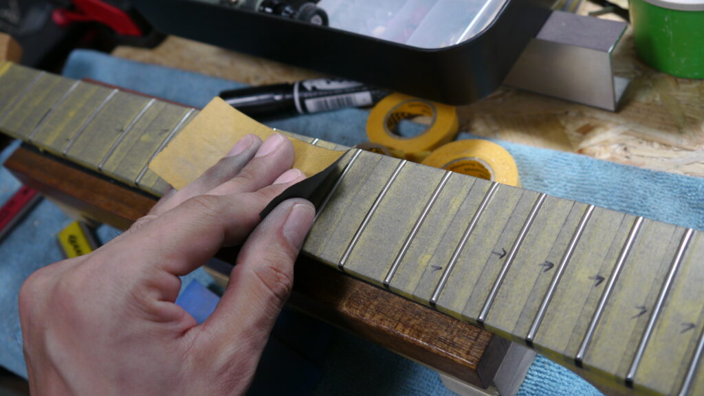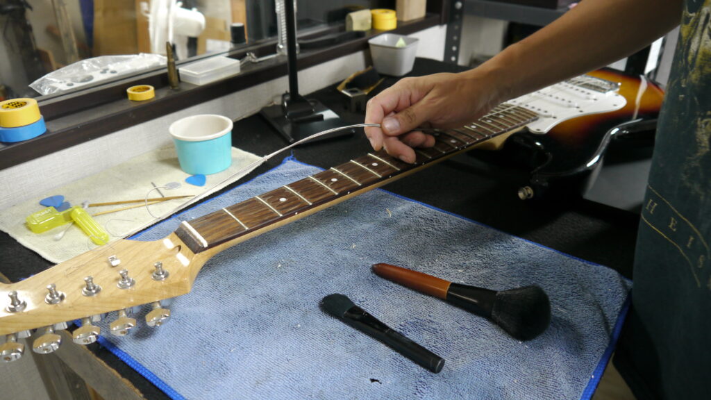 すり合わせ後は、必ずリクラウニング(フレット頂部の丸み)を再度作り出す作業も行います。これにより、弦が滑らかに動き、チョーキングの感触とサウンドが良くなります。