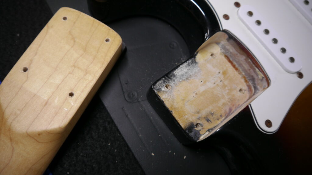 ノブ類を外すと、ピックガードの下(普段は見えない部分)にも汚れが見られました。