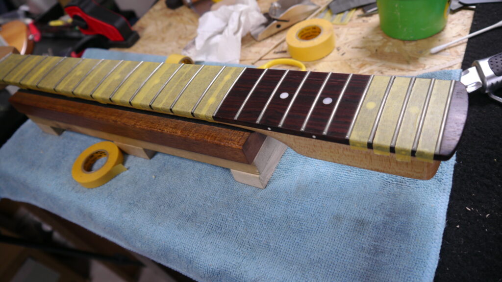 まずはネックを適切な状態(まっすぐ)に整えた上で、平坦でビビりのない完璧なフレット面を作り出す工程に入ります📐🔧