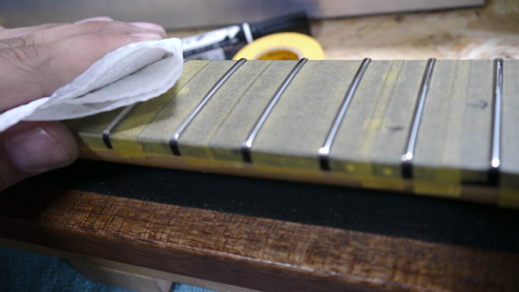 指板に溜まってしまっていたフレット際の頑固な汚れを専用工具で細かくクリーニングし、キレイにしていきます。その後、天然のココナッツオイルでケアし、木材の乾燥を防ぎ、潤いと保護を与えてまいります🌿✨