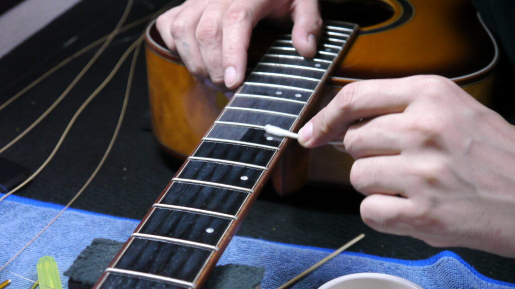 乾燥した指板への十分な保湿ケアと、フレットのポリッシュによる滑らかさの回復。