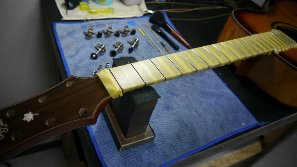 まずはネックの状態を整え、その後にフレットポリッシュを行います✨