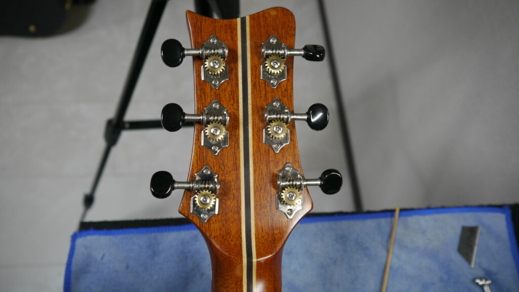診断で発見されたネックの逆反りとそれに伴うビビり、浮き上がったペグブッシュ、指板の乾燥を、ネック調整、ブッシュの再接着、指板の入念なケアとクリーニング等を含むトータルメンテナンスにより、一点一点丁寧に解消。