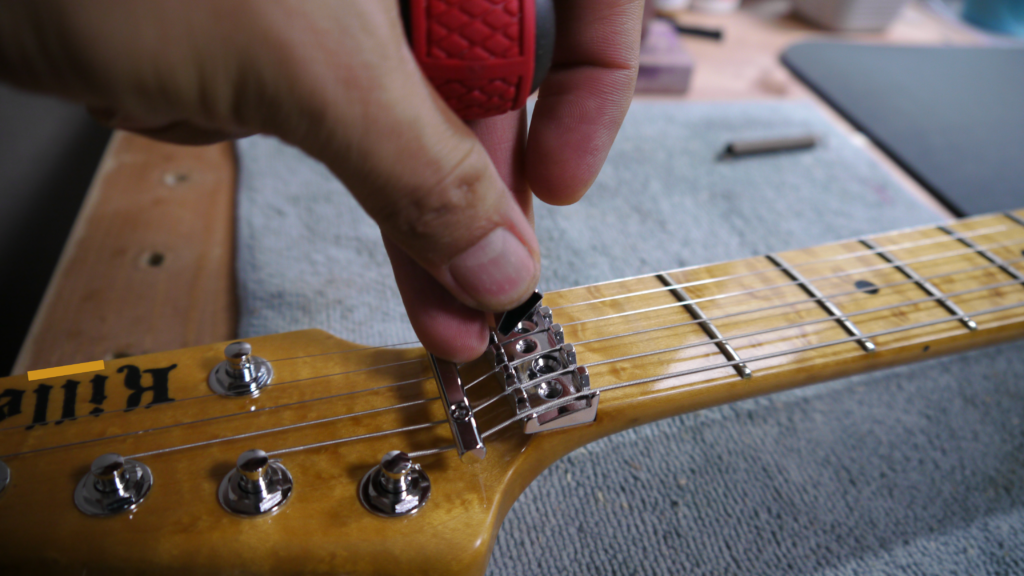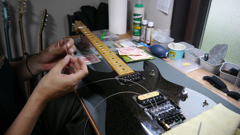 弦を全て取り外し、ナットを丁寧に外してまいります。塗装や周辺パーツを傷つけることのないよう、細心の注意を払いながら作業を進めます🔧✨