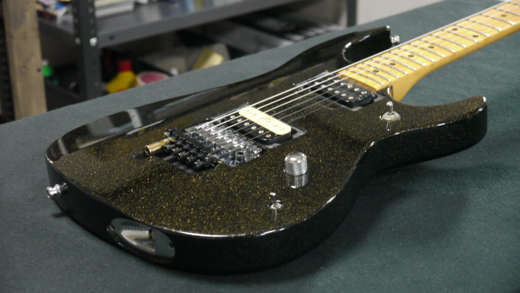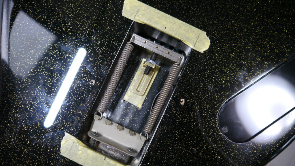 診断により、フロイドローズのスペーサー状態や全体的なバランスの乱れが妨げていることが判明。ザグリ加工に頼らずとも、ネック調整、ブリッジ・電装部のディープクリーニング、精密なトータルセットアップ等により、これらの課題を一点一点丁寧に解消いたしました。