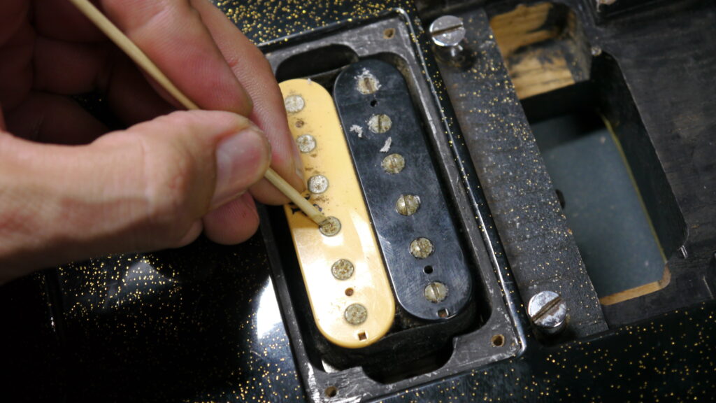 ピックアップには磁石が内蔵されており、サビが付着すると磁気特性や出力バランスに影響を及ぼす場合がございます。今回は竹製を使用し、手作業で丁寧に除去してまいります(傷がつきにくい素材ではございますが、ご自身でお試しになる際は力加減や使用する道具にご注意ください。あくまで自己責任での実施をお願いいたします)🧲✨🛠️