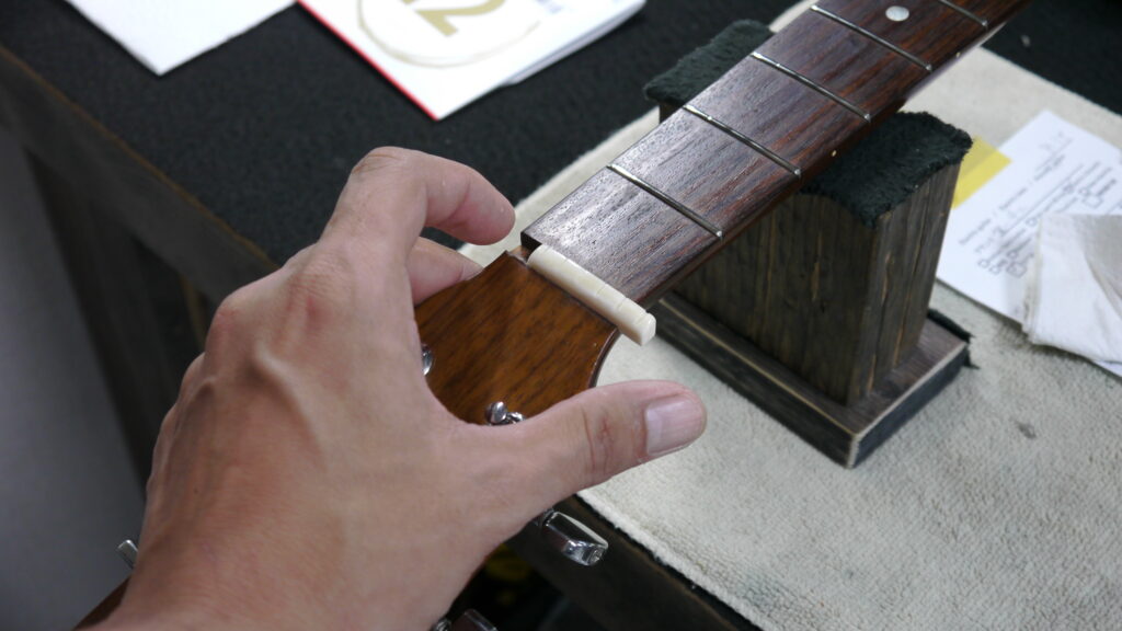 弦高が高くなってしまっていたこともあり、この一本とお客様のご要望に合わせてサドルを削って低くしていきます。適切な高さに調整することで、演奏性とサウンドバランスを最適化してまいります🔧🎸✨