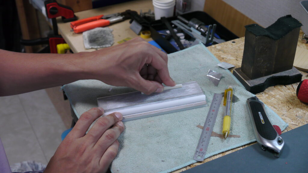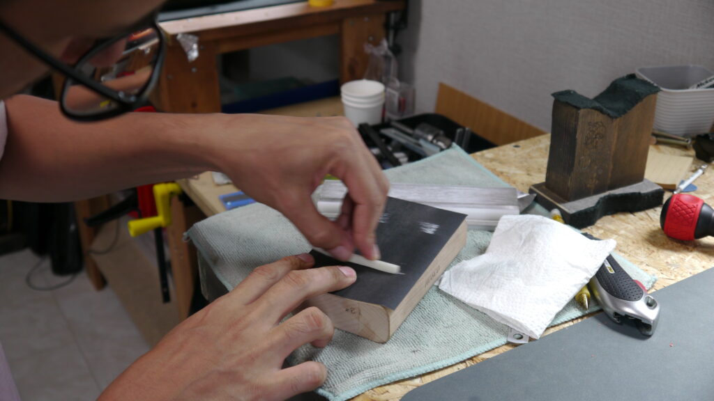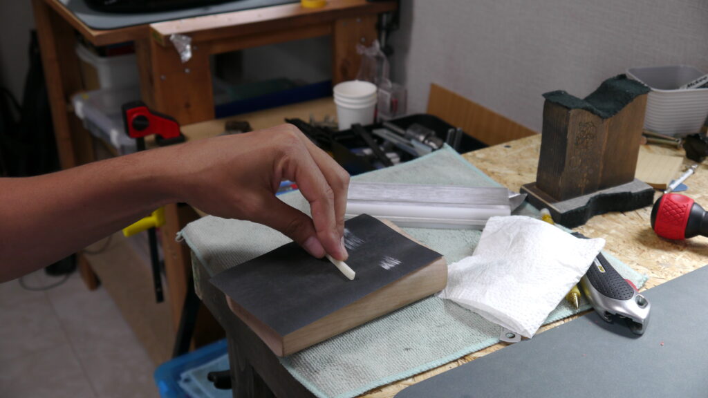 お預かりしたギターに合わせて何度も木材の様子をみながら調整を行っていきます。こちらの木材はまだオイルの吸い込みが必要だったため、細かく状態を確認しながら重ねて塗布していきます✨🎸