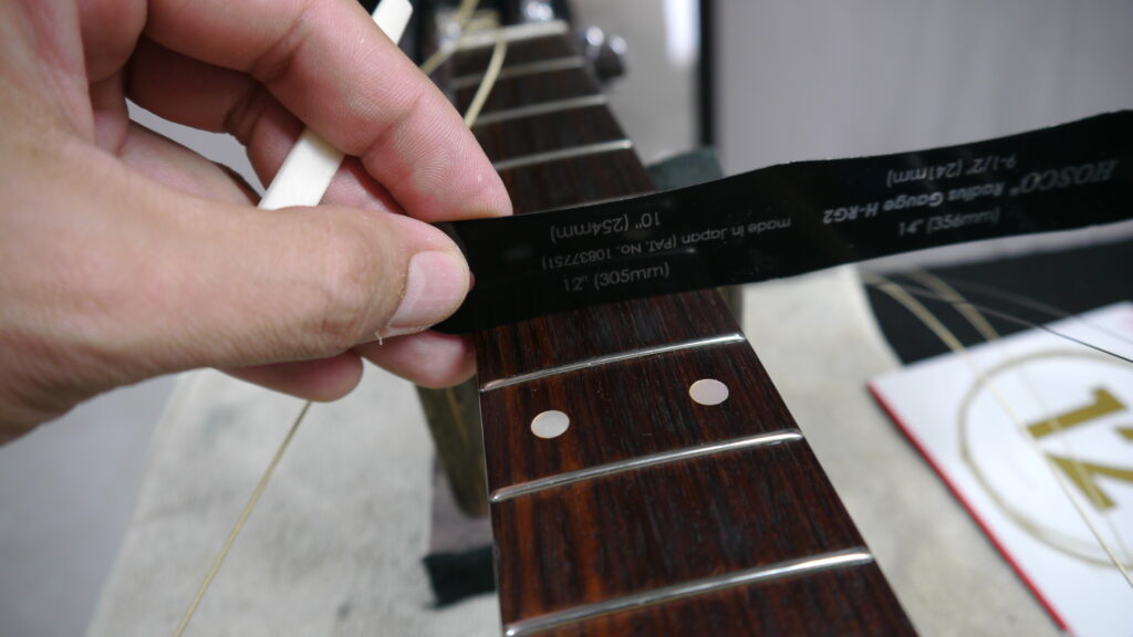 続いては弦を張る前にこのギターのRを確認していきます。