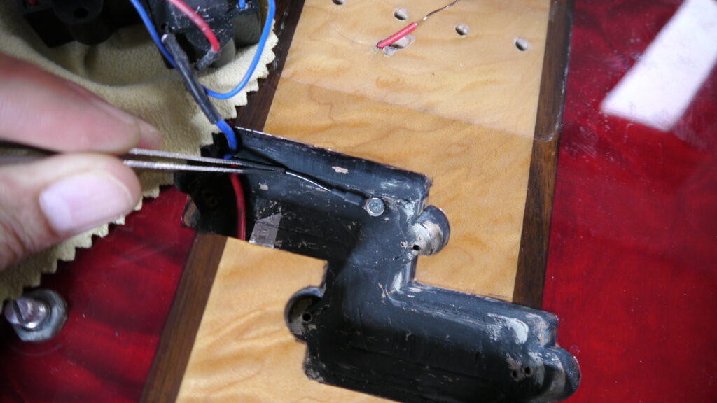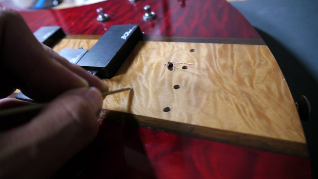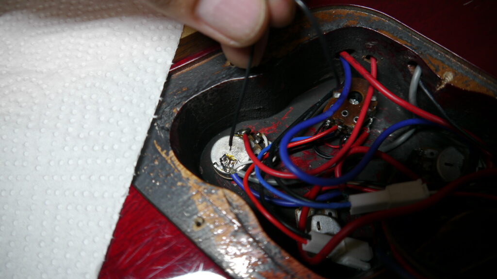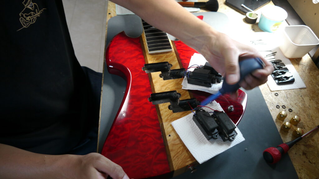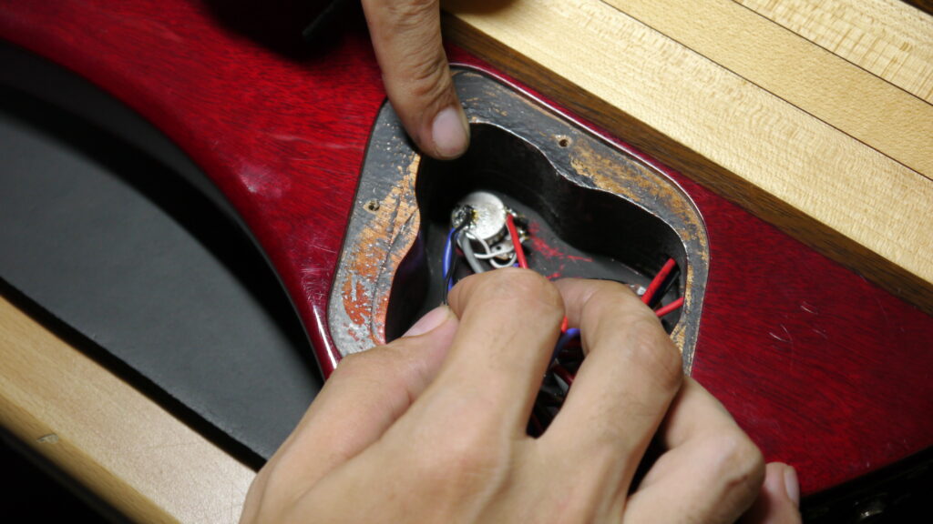 診断で発見されたキャビティ間のアース不良、接点の経年劣化等を、アルミテープによるキャビティ接続、ハンドメイドアース線の制作とラグ止め、ジャック部分の清掃・再ハンダ付け等によるアース回路の徹底的な整備、さらにフレットポリッシュ、指板ケア、弦高・オクターブ・ピックアップの精密調整を含むトータルセットアップにより一点一点丁寧に解消。