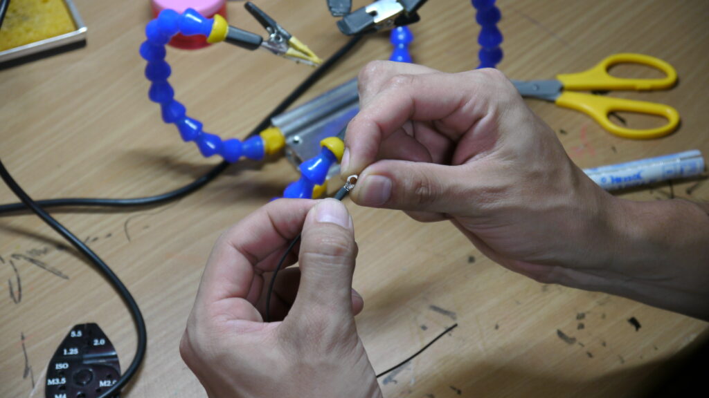 続いては、アース配線用ラグを使用し、この一本に合わせてハンドメイドのアース線を制作しました。