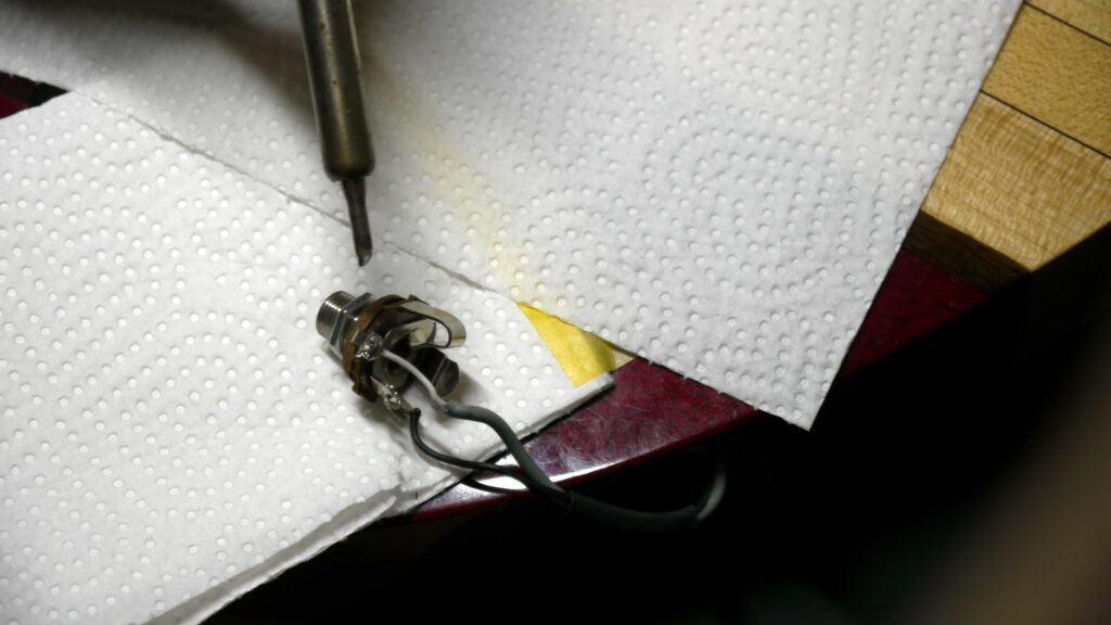 アルミテープによるキャビティ接続、ポットとキャビティ間のアース配線修正、ハンドメイドアース線の制作とラグ止め、ジャック部分の清掃・再ハンダ付け等