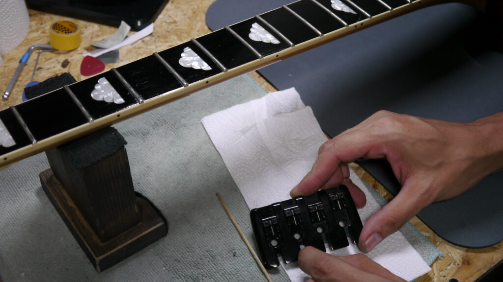 接合面がピッタリと密着することで、振動伝達が向上し、サステインやサウンドの抜けが良くなります。細かい部分ですが、とても重要な工程です🧼✨🔧🎸